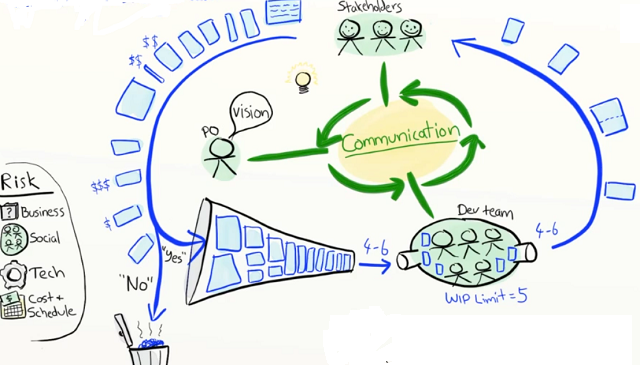 Still the development organization as a whole is overburdened with work due to a big upfront planning process in which all of the work for one calendar year has been defined and estimated and committed by the management until July of the previous year. This was the fourth problem addressed by top management itself. A team worked on this process during the next couple of months, with the goal to rely on rough roadmaps instead and to introduce three-monthly portfolio planning cycles. Now in a third event end of April 2017, we have worked with the managers on this topic in order to get everybody into re-defining their current product development goals so that they can be measured and sliced down into smaller sub-goals which result in deliverable slices of products.